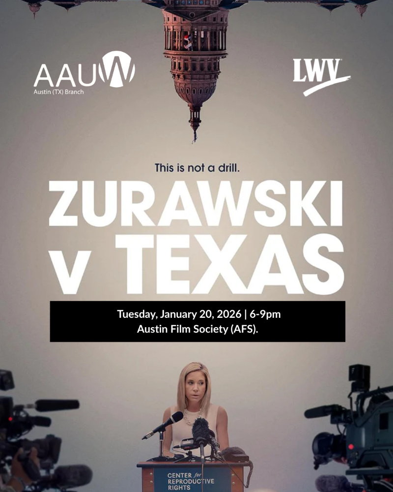 Join the American Association of University Women (AAUW) Austin Branch and the League of Women Voters of the Austin Area (LWVAA) at the AFS theater for a screening of the documentary film Zurawski v Texas followed by a talk-back panel featuring lead plaintiff Amanda Zurawski; Chief Operating and Medical Services Director for Planned Parenthood Dr. Amna Dermish; and State Representative Donna Howard, a leader in the Texas Legislature on women's health policy, nursing, and accountable government.