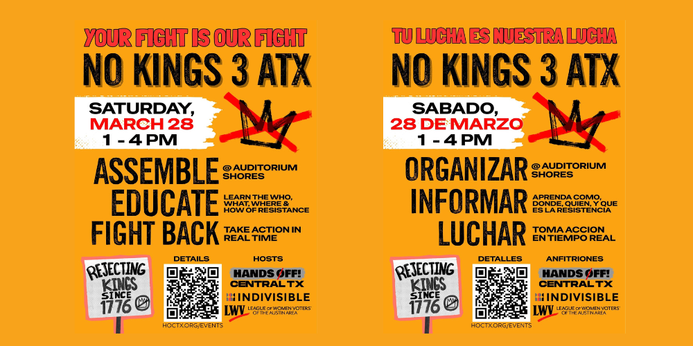 On Saturday, March 28, join Hands Off Central Texas, LWVAA, and other Central Texans at the No Kings 3 rally. Let's defend democracy and declare that America does not belong to wealthy special interests -- it belongs to the people.