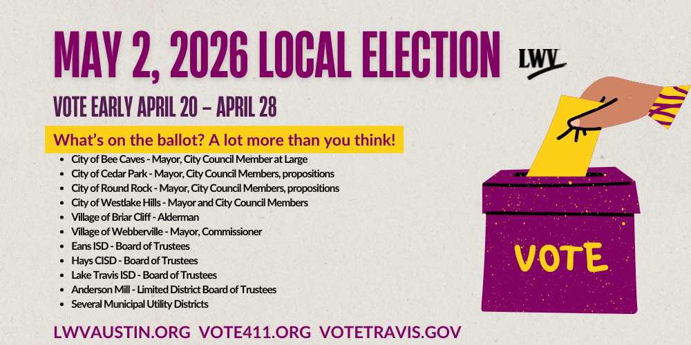 Donations to LWVAA empower and educate voters by connecting them to the vital, nonpartisan information they need to claim their voice in the democratic process. Instead of selecting a higher dues amount, add a separate donation to LWVAA when you join or renew; 100% of your donation will be put to work right here in the Austin area.
