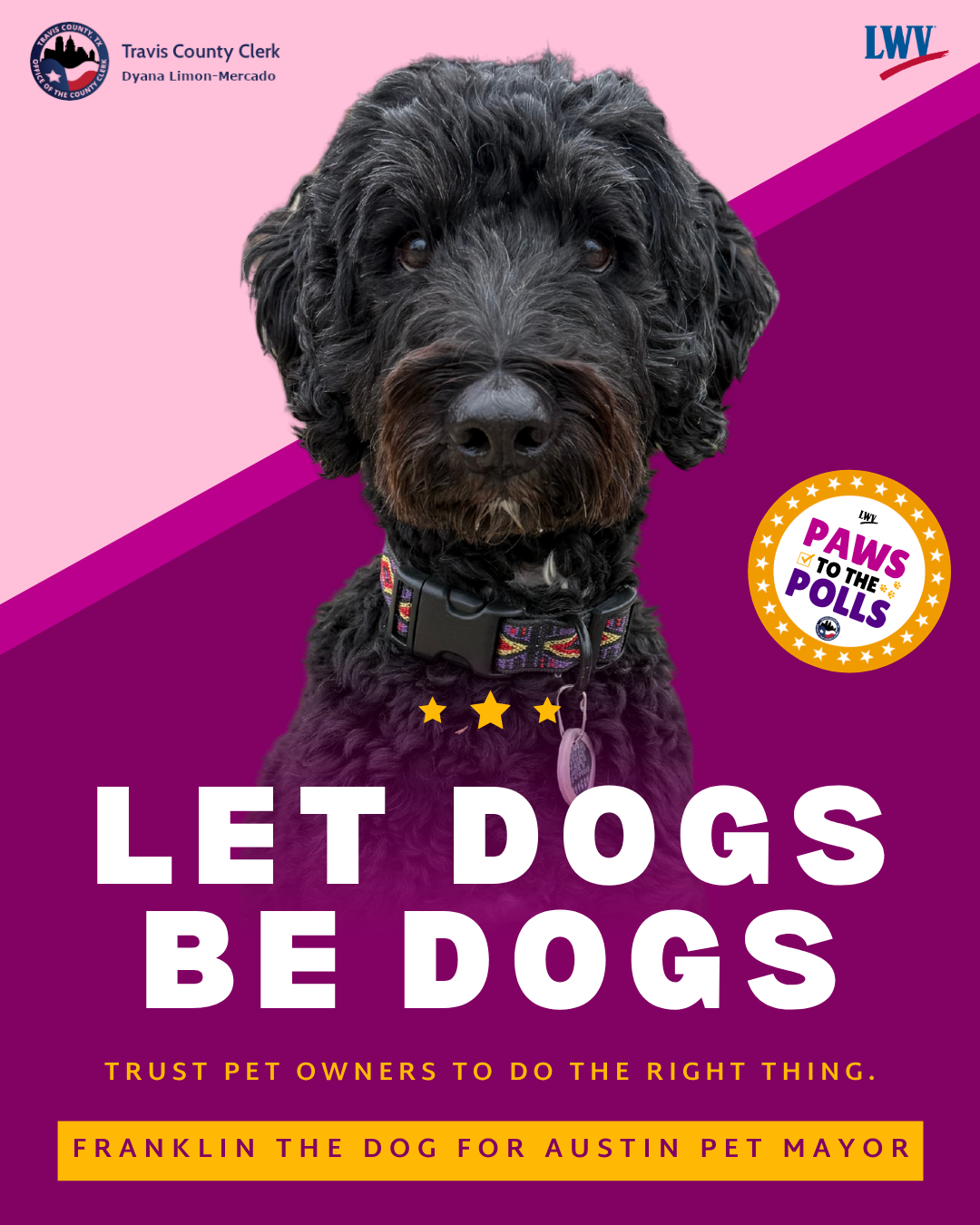 |  | Look who is running for mayor in the Paws to the Polls: the Great Austin Pet Election coming this summer! Stay tuned next week to see who Franklin is running against. |